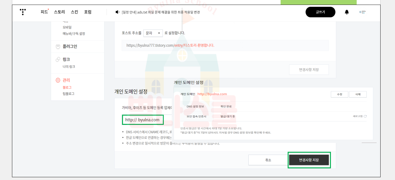 도메인 연결 화면에서 티스토리를 선택 후 아래쪽에 저장을 클릭 후 연결을 완료합니다.