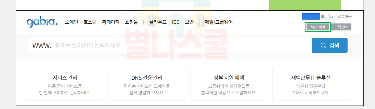 가비아 사이트에 다시 로그인하고 우측 상단에 있는 My 가비아 메뉴를 선택합니다.