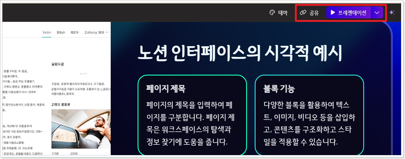 마무리 작업을 하고 다운로드 및 공유 등을 진행하면 됩니다. 프레젠테이션을 클릭하면 바로 발표자료로 만들어집니다.