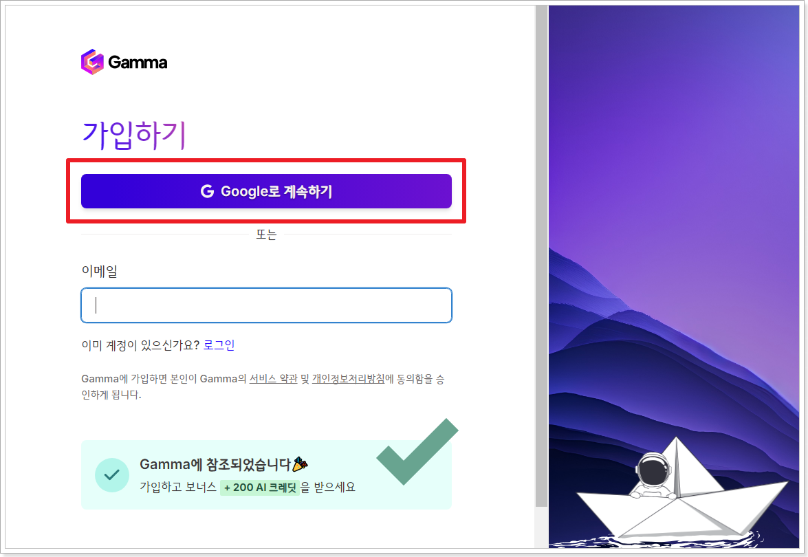 시작을 위해서 감마AI 가입을 시작합니다. 가입을 하면 400 크레딧을 받을 수 있으며 아래 코드로 가입 시 추가로 200 크레딧을 더 받을 수 있으니 시작하는 분들이거나 또는 새로운 구글 계정으로 시작하시는 분들은 추가 크레딧받고 시작하시면 됩니다.