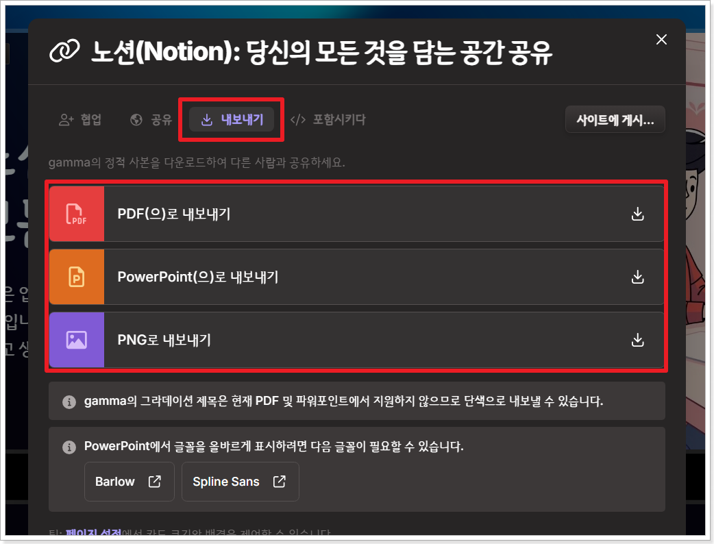 내보내기 기능에서는 PDF, 파워포인트, PNG로 내보내기를 할 수 있습니다.
