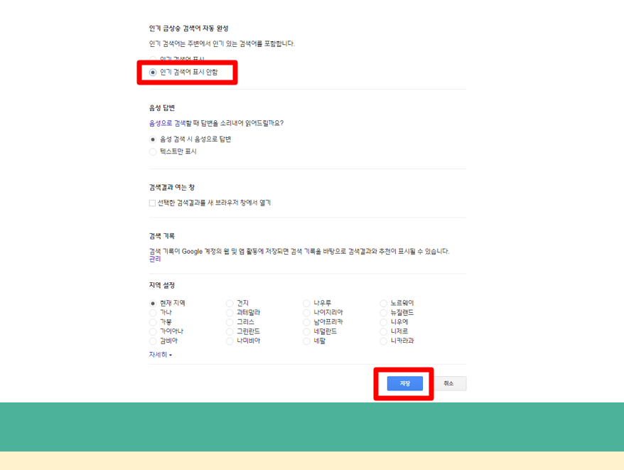 검색설정 화면의 검색결과 메뉴에서 인기 급상승 검색어 자동완성 부분을 표시 안함으로 바꿔준 후 저장한다.