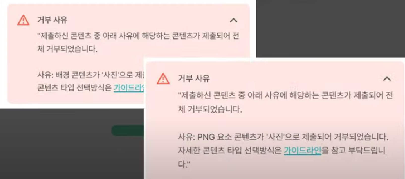 제출한 콘텐츠가 거부가 되는 경우도 있습니다. 거부사유가 없이 바로 승인이 나면 좋겠지만 기여자라면 자주 겪는 상황이니 업로드 전 확인할 부분을 조금 더 꼼꼼히 체크해야 합니다. 대부분 사진과 배경 선택을 잘못하였거나 PNG 콘텐츠를 사진으로 제출하는 경우가 많은데 이런 경우 콘텐츠 타입만 변경해서 다시 업로드하면 거부 사유가 해결되고 승인이 나는 경우가 많습니다.