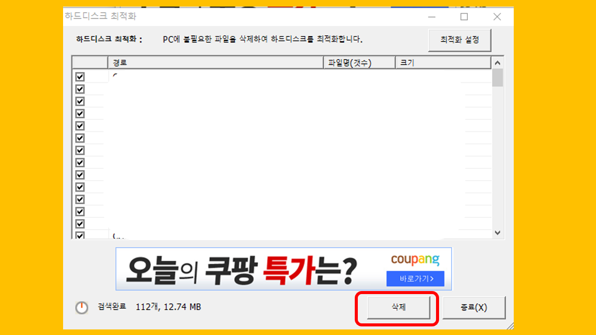하드디스크 최적화란 임시 인터넷, 쿠키 파일을 삭제하는 것입니다. 인터넷 검색을 하다보면 쌓이게 되는 필요 없는 파일로 속도가 느려질 수 있으니 가끔 실행하도록 합니다.