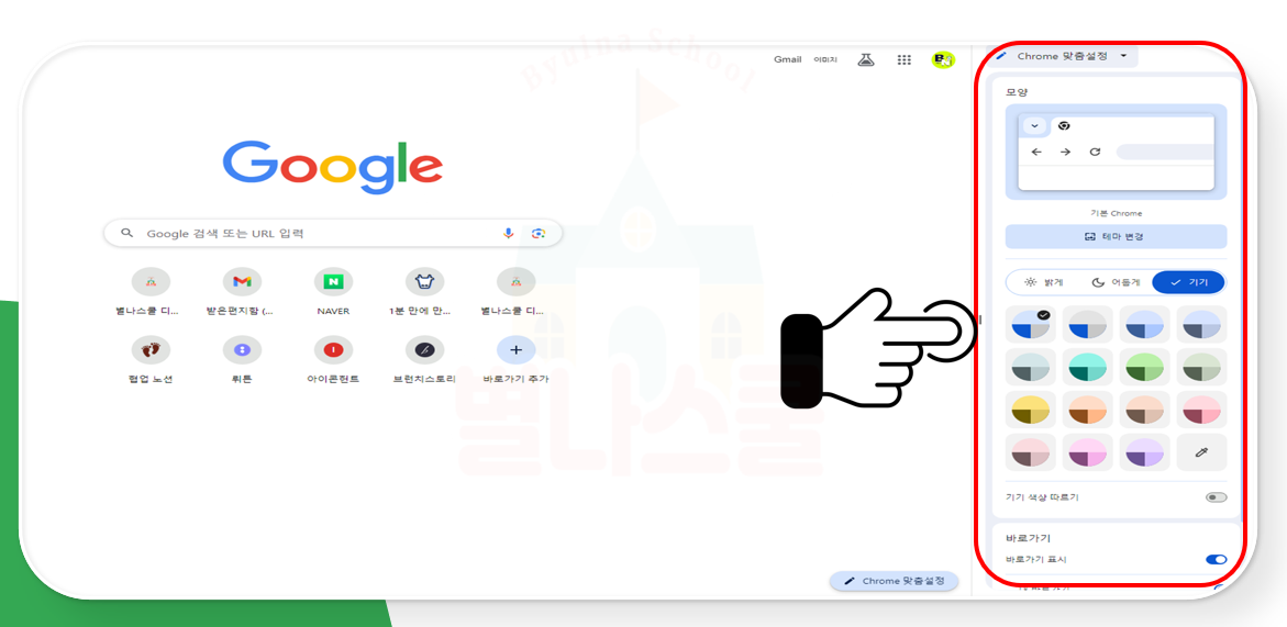 브라우저 화면의 우측 하단에 맞춤설정 기능을 볼 수 있습니다. 예전에는 설정에서 활용했던 기능이지만 현재는 메인 화면에서도 활성화할 수 있으니 참고합니다.
