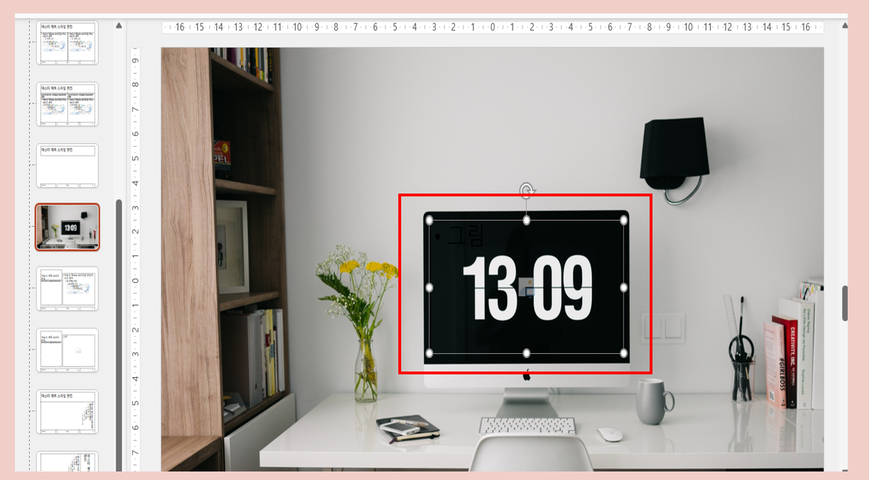 아래 이미지에 보이는 모니터의 시간 화면 부분에 내가 원하는 이미지를 넣을 수 있게 만들기 위해서 슬라이드 마스터 메뉴의 개체툴 삽입, 그림 메뉴를 선택합니다.